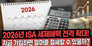 3줄 요약 2026년부터 ISA 세제혜택이 대폭 확대! 비과세 한도 증가와 소득 요건 완화로 더 많은 사람들이 절세 혜택을 누릴 수 있습니다. 기존 ISA 가입자도 확대된 혜택을 받을 수 있으며, 신규 …